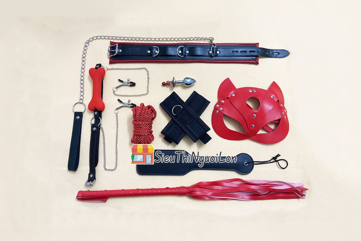 Bộ đồ chơi gồm mặt nạ che mắt, khóa miệng, khóa cổ, khóa tay chân, roi da và chổi lông massage, tạo nên những trải nghiệm đa dạng và độc đáo. Mặt nạ giúp tập trung tăng cường cảm nhận các giác quan khác, khóa hàm tạo âm thanh rên rỉ đầy kích thích, còn roi da cùng chổi lông giúp truyền cảm hứng mê hoặc, kích thích các điểm nhạy cảm.